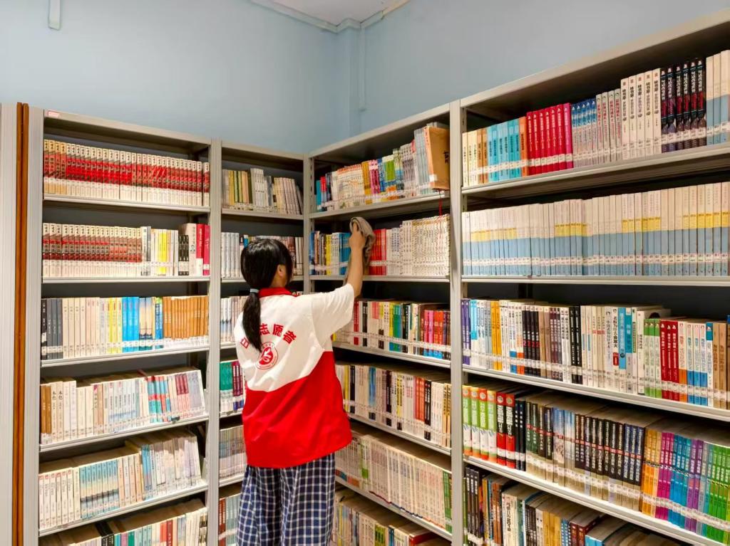 活动当天,身着志愿马甲的同学们准时抵达穗丰村图书馆,迅速分工、默契配合。大家以饱满的热情投入工作:部分志愿者仔细擦拭书架、桌椅与窗台,不放过一丝灰尘;有的认真清扫走廊、角落,清理卫生死角,让图书馆环境焕然一新;还有的对书架上的书籍进行分类整理、整齐归置,方便读者快速查找所需书籍。每一个动作都细致认真,每一处细节都用心打磨。