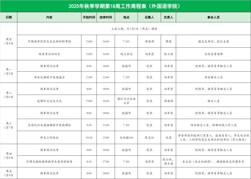 关于2025年秋季学期第18周工作周程表