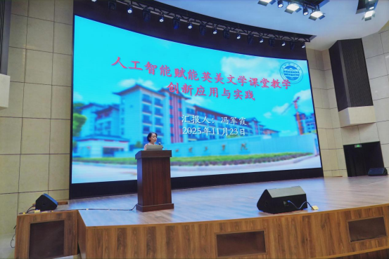 冯军霞教授作为特邀专家,在论坛上作了题为《人工智能赋能英美文学课堂教学创新应用与实践》的主旨报告,以其深厚的教学实践与前沿的学术视野,为与会者系统阐释了“师—生—AI”三元协同育人的智慧教学新范式。
